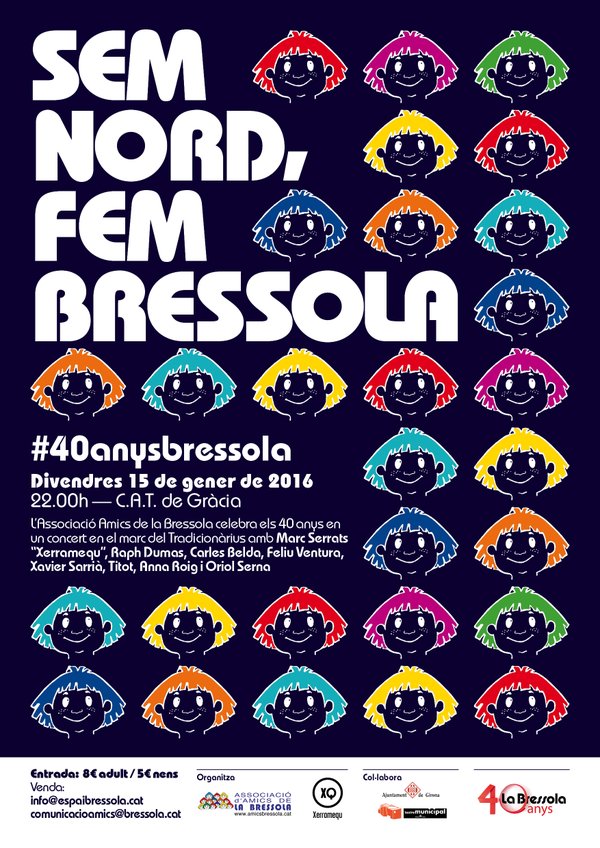 Enguany, el Xerramequ i l’Associació d’Amics de la Bressola s’alien amb el Festival Tradicionàrius per parir una nit (gairebé) única d’homenatge als 40 anys de lluita de la Bressola i el seu compromís amb la llengua i cultura catalanes més enllà dels Pirineus. “Sem nord, fem Bressola!” tindrà lloc aquest divendres a Gràcia, amb una banda liderada pel Marc ‘Xerramequ’ Serrats i les col·laboracions de Feliu Ventura, Xavi Sarrià, Carles Belda, Raph Dumas, Anna Roig, Titot i Oriol Serna. L’espectacle repassarà les cançons més populars de l’exitós primer àlbum ‘Musiquetes per la Bressola’ (Propaganda pel fet! 2008) i dels dos discos posteriors. L’actuació, emmarcada dins el Festival Tradicionàrius, tindrà rèplica amb el Xerramequ acompanyant la mainada de la Bressola una setmana després al Teatre Municipal de Girona.