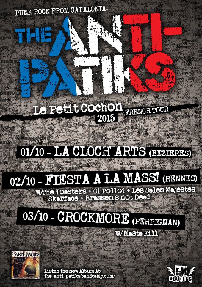 Diu que estan esveradíssims i que ho volen fer saber fins i tot més enllà dels Pirineus. El millor grup de (punk) rock català del moment i des d’Ullastrell, The Anti-Patiks, continua patejant escenaris i presentant el seu darrer àlbum ‘Comptes vells, baralles noves’ (Propaganda pel fet! 2015) i aquest proper cap de setmana estrenaran l’octubre amb incursió a l’estat francès en un mini-tour que els ha de dur a Béziers, Rennes i Perpinyà. El dia fort serà el del mig, ben lluny de la mediterrània i d’Ullastrell i cap al cantó de París: Rennes. The Anti-Patiks prendran part del festival de ska i punk Fiesta La Mass i comparteixen nit i cartell amb grups mítics com The Toasters, Oi Polloi o Skarface, entre altres. Dijous de pujada passen per Béziers i dissabte de baixada els trobareu a Perpinyà, al no-gens-menys mític Le Crockmore amb el grup Masta Kill.