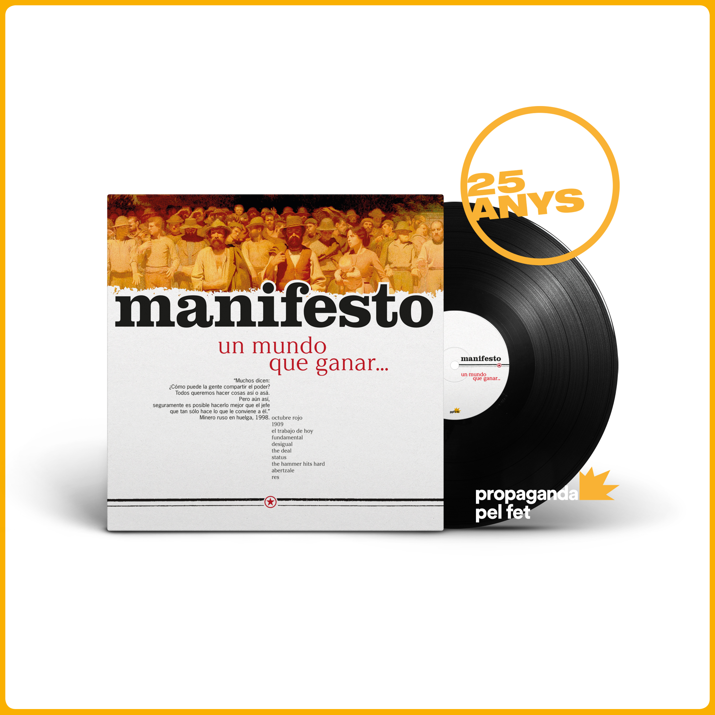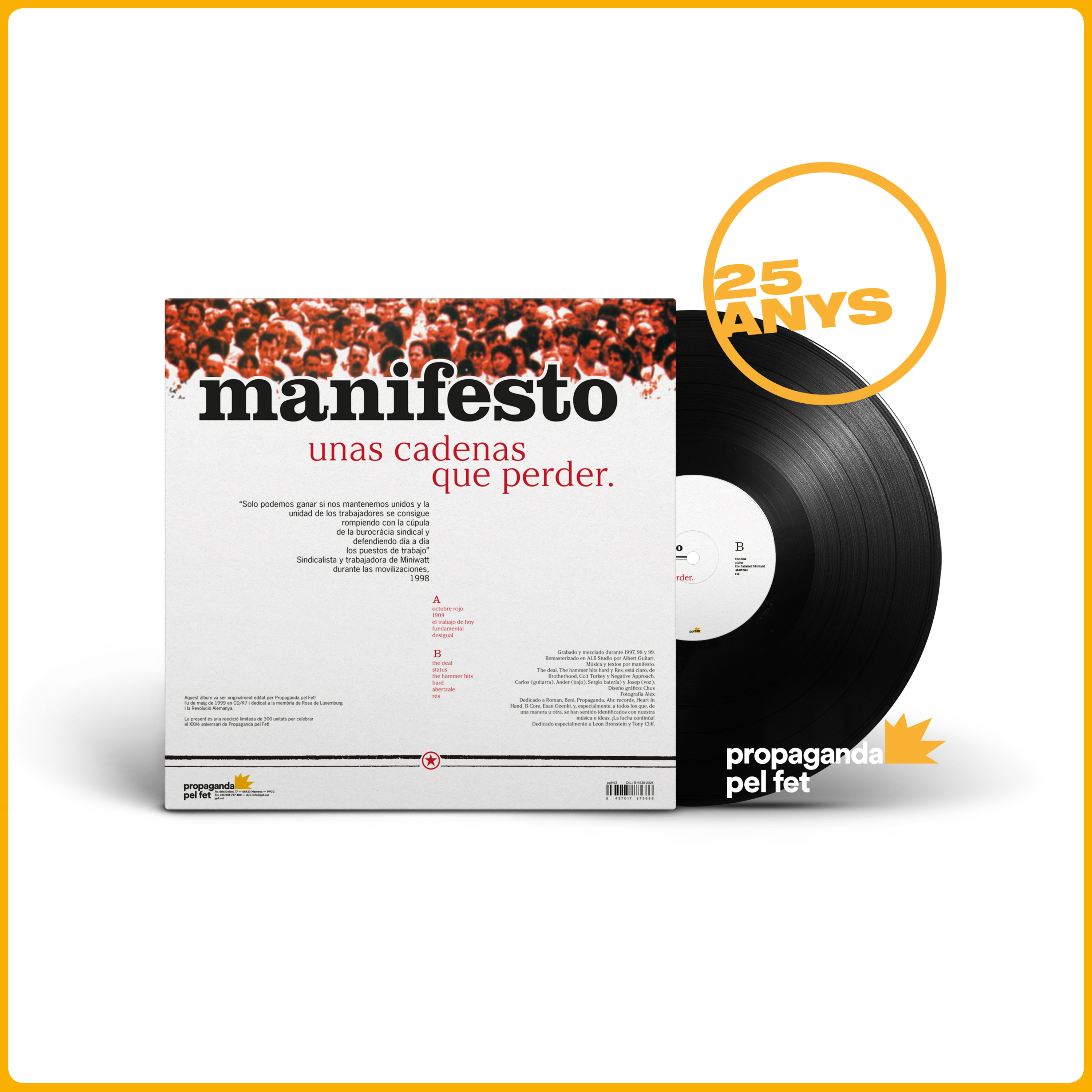 Fem 25 anys i no ens estem de res. Estem d’aniversari i la millor manera de mirar endavant… és fer memòria. i reparar els greuges acumulats amb el pas del temps! I un, d’històric, era posar en circulació digital, ara que som al sXXI i tot segueix gairebé igual, el mític àlbum de la no menys-mítica banda barcelonina de hardcore roig i combatiu Manifesto, ‘Un mundo que ganar… unas cadenas que perder’. A partir d’avui, ja podeu cremar la vostra plataforma preferida amb les 10 canonades dels de Barna. A més, per celebrar-ho com cal, reeditem el disco en una edició limitada de 300 unitats de vinils 12” de 180 grams a 45RPMs perquè trinxeu el giraplats, l’equip hi-fi de casa i l’envà que us separa del veí fatxilla, esquirol o consumidor habitual de les notícies de La Sexta. Les precomandes són obertes a manifesto.ppf.cat
