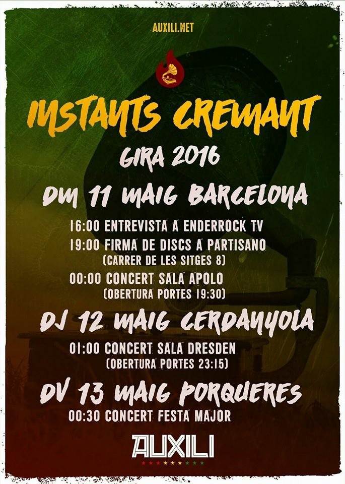 Auxili vénen amb força tot presentant el seu darrer disc ‘Instants cremants’. La reggae band d’Ontinyent inicià a principis d’abril el tour de presentació del nou treball a Benimaclet davant de més de 10.000 persones, posà la cirereta d’un primer mes de gira de somni al Viña Rock amb un show guanyador (vídeo) i encaren el maig amb l’agenda plena. La propera parada és la presentació del disc a Barcelona, que tindrà lloc dimecres 11 de maig a l’Apolo amb un festival èpic: a l’actuació dels Auxili s’hi suma la participació de Banda Bassotti des d’Itàlia, dels mítics The Toasters des del Lower East Side de Manhattan (NYC) i dels catalans A4Orchestra. Els d’Ontinyent no trauran el peu de l’accelerador i dijous continuen les presentacions a Cerdanyola (Sala Dresden) i dissabte a Porqueres! Gas!