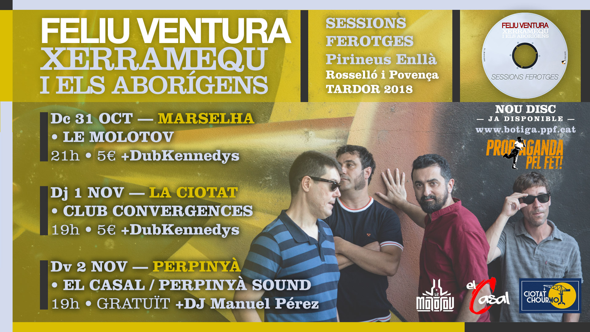 Durant el mes d’octubre, novembre i desembre, les ‘Sessions Ferotges’ passaran pel Festival Accents a Alcover, el Festival Connexions a Barcelona, les Borges Blanques, La Bisbal d’Empordà i enfilaran Pirineus enllà en un mini-tour septentrional que passarà per Marselha, La Ciotat i Perpinyà.